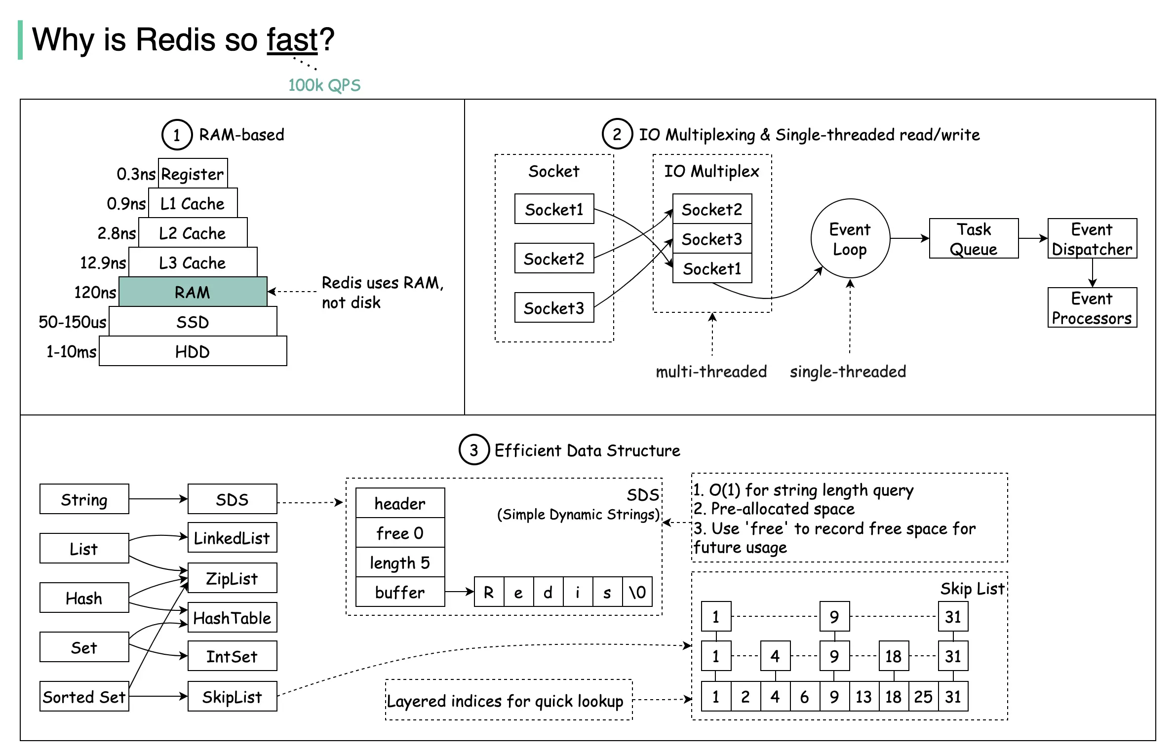内存访问速度比 SSD 快 数百倍,比 HDD 快 数万倍,这是 Redis 高性能的根本原因